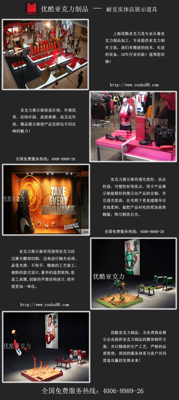 上海優(yōu)酷嘉定亞克力制品工廠,專業(yè)從事商場及各類亞克力制品的制作生產(chǎn),從事商場道具行業(yè)的設計制作生產(chǎn)20多年,曾參與東方明珠大堂裝修工程,上海浦東第一八百伴開業(yè)慶典設計制作。從業(yè)20多年為國內外幾千家大型商場和知名連鎖專賣店提供了各類道具及亞克力制品。